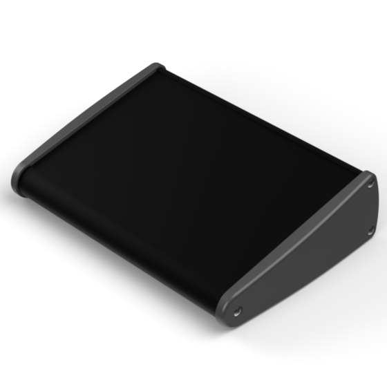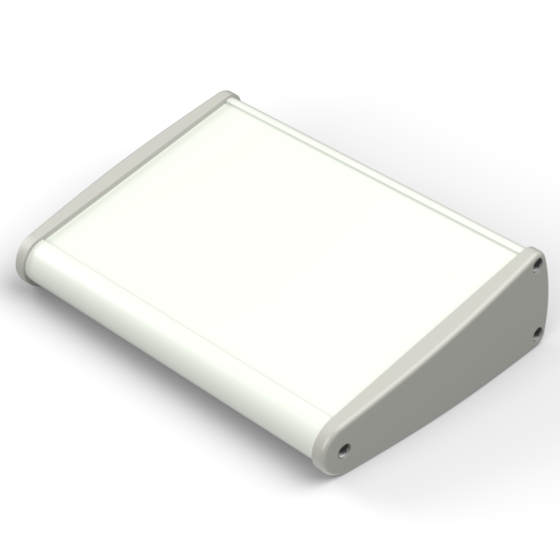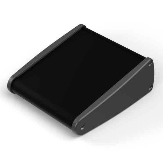 Contenitore in alluminio estruso inclinato con verniciatura esterna a polvere di elevato standard qualitativo. Due pannelli laterali in ABS, guide interne per PCB, parte superiore con area ribassata per l’alloggiamento di una tastiera a membrana. Chiusura a sei viti. Disponibili due combinazioni di colore: Nero RAL 9004/ Grigio scuro RAL 7012. Su richiesta, supporto per fissaggio a parete mod. “MT7.0”.