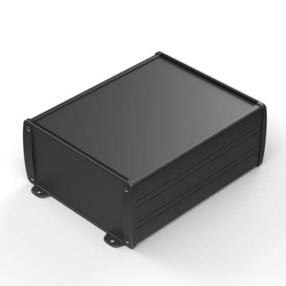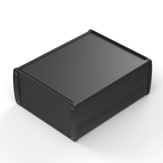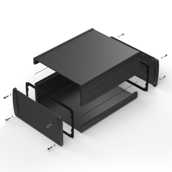 Contenitore in alluminio estruso con verniciatura esterna a polvere di elevato standard qualitativo. Due pannelli frontali in metallo, guarnizioni in gomma per protezione da acqua e polvere (IP65), guide interne per PCB e parte superiore con area ribassata per l’alloggiamento di una tastiera a membrana. I modelli con “-E” sono dotati di pannelli in metallo flangiati per montaggio a parete. Chiusura a otto viti.