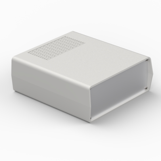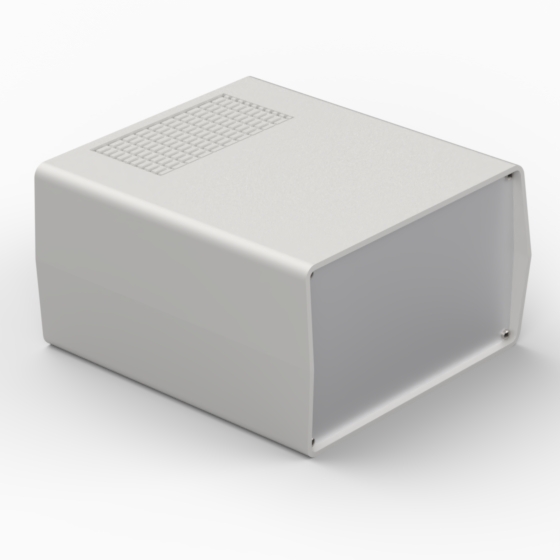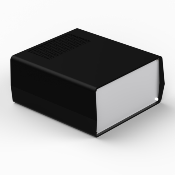 Contenitori in ABS con superfici opache e dotati di due pannelli frontali in alluminio di spessore 1 mm. I gusci superiori ed inferiori sono dotati di una foratura per aerazione e sono dotati di punti di fissaggio per PCB. Chiusura a otto viti.