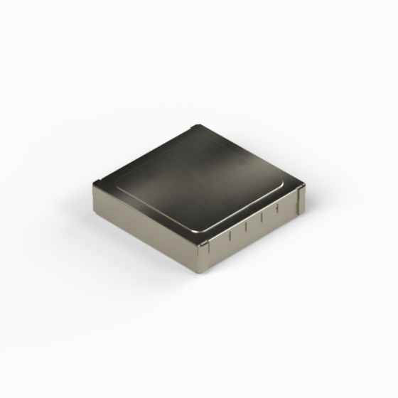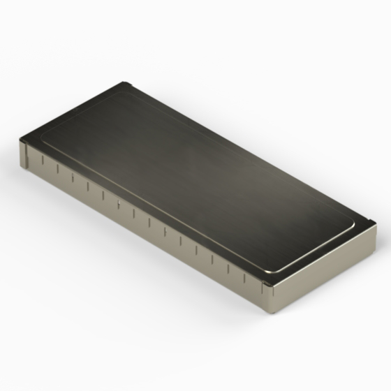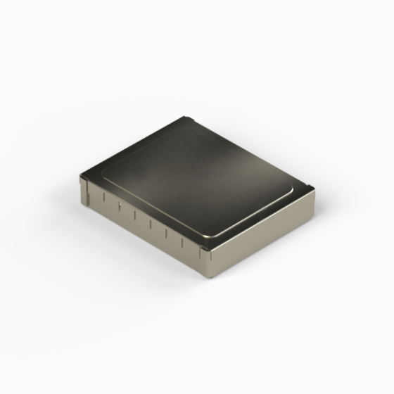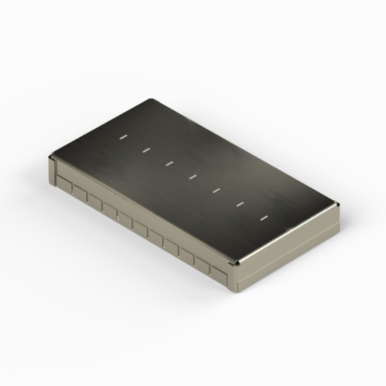 Contenitori in acciaio stagnato a fuoco con coperchio a molla e chiusura a scatto fornito con divisori verticali forati e tranciati per il montaggio cablaggi. Facile accesso al circuito stampato.