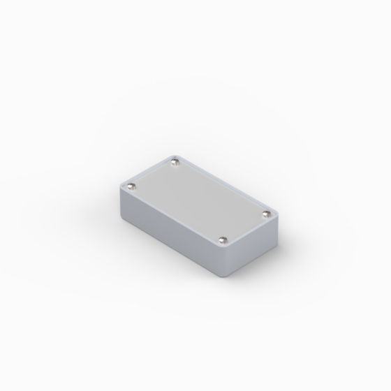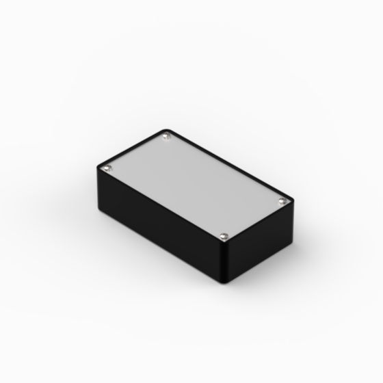 Contenitore in ABS con angoli arrotondati dotato di pannello superiore in alluminio di spessore 1 mm. e con chiusura a 4 viti. Pareti con superfici lucide all’interno delle quali sono presenti delle guide per PCB.
